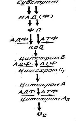 Процесс окисления субстрата в дыхательной цепи сопровождается фосфорилированием АДФ и запасанием энергии в форме АТФ. В цепи окисления есть три участка фосфорилирования: участок окисления флавопротеидов, участок перехода электронов от цитохрома В к