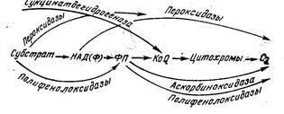 В цепи окисления из оксидаз основную роль играют цитохромы, состоящие из специфического белка и железопорфирина. Цитохромы способны обратимо окисляться и восстанавливаться благодаря ионам железа, входящего в их состав. Восстановление окисленных цитохромов происходит вследствие присоединения электронов KoQ либо флавопротеидов. Окисление цитохромов проходит через цепь, состоящую обычно из четырех различных цитохромов. Последним в цепи является цитохром Аз,