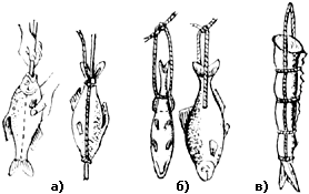 Теперь можно коптить рыбу. На дно ведра или бочки загружается смесь ольховых или других чурочек с добавкой можжевельника, а на решетках из металлической проволоки в средней и верхней части сосуда размещается рыба, более крупная – внизу. Она укладывается неплотно в один слой. Обвязку, выполненную суровым шпагатом (синтетику не применять!) не снимают. Под бочкой разводят костер и по возможности плотно закрывают ее крышкой или металлическим листом. Через 30...60 минут в зависимости от размера рыбы и коптильни дым из-под крышки становится сухим и приобретает характерный аромат. Окончательно готовность определяется по внешнему виду рыбы, золотисто-чайному цвету и сухой поверхности шкурки. При этом коптильню можно открывать лишь на очень короткое время, чтобы не воспламенились чурки из-за доступа воздуха.