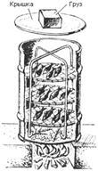 Этот способ имеет много преимуществ. Он быстрый, надежный, простой; рыба сразу готова к употреблению. И сооружений сложных не надо. Есть металлическая бочка – прекрасно, нет – можно обойтись старым ведром, только их надо тщательно прокалить. Обязательное условие – хорошо подогнанные крышки. Как использовать эти емкости – ясно из рисунка. Вставные сетки, на которые кладется рыба, делаются из отожженной стальной проволоки диаметром 4...6 миллиметров.