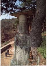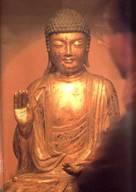 Памятником уникального значения является также статуя Будды Х—ХI веков, вылепленная из глины и покрытая густыми слоями золотого лака. Позади нее остроконечный ореол - мандала из резного позолоченного дерева великолепной работы, в виде струящихся кверху языков пламени. Будда сидит в традиционной позе со скрещенными ногами и со сложенными в условном жесте - бхумиспарша-мудра - руками. Его правая рука протянута к подножию, а левая ладонью вверх лежит на сложенных ногах, подобно рукам Будды из Соккурама. Лицо корейского типа, с мягким очертанием овала и круглым подбородком, лишено суровости и внутренней сдержанности, присущих ранним буддийским статуям Кореи. Блеск золотого ореола и игра света на складках одежды создают торжественность и праздничную приподнятость образа. В статуе отразилось характерное для того времени стремление к пышности и парадности.