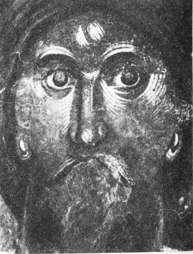 Тонкое изможденное лицо Иоанна Златоуста (мастера проповеднической прозы IV века) с впалыми щеками и огромным лбом, словно иссушено напряженной работой мысли. Рядом с ним — Василий Великий (оратор, писатель, дипломат IV века) с упрямой складкой губ и крупными характерными чертами — образ человека, менее утонченного, но зато более сильного, более способного к действию, что очень точно подтверждает его активная и многогранная деятельность. Если по подбору сюжетов мозаики Софии весьма точно следуют схеме, принятой в Константинополе, то во ; фресках гораздо больше свободы и в выборе 'сюжетов, и в их иконографии, и в художественном решении. Еще больше местных черт в единоличных изображениях, которыми изобилует храм. В ряде случаев встречается славянский тип лиц — широких, округлых, со смягченным рисунком черт. Попадаются и славянские надписи.