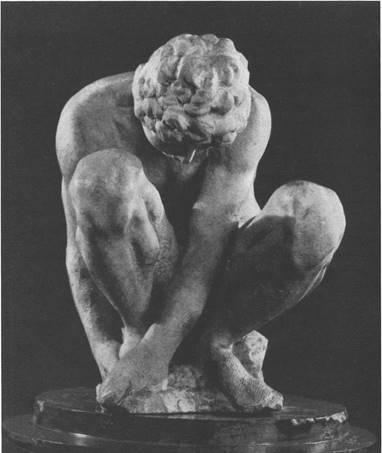 Юноша, согнувшись и наклонив голову, касается руками правой ступни. Напрасно искать какую бы то ни было мотивировку этого движения. Жанровые, бытовые черты просто не существовали для Микеланджело. Человек начинался для пего там, где можно было поведать о его героических деяниях и свершениях. Недаром спина мальчика подчеркнуто мускулиста и мощна. Не лицо, а тело и поза раскрывают созданный мастером образ.