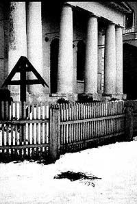 Могила иеросхнмонаха Иоанна (Малиновского). На заднем плане - храм Иоанна Предтечи, справа — домик И.В.Гоголя.