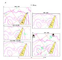 В периоды образования провалов в вершинном кратере Ключевского вулкана и ослабления или прекращения извержений, одновременно с перемещением сейсмичности в низы коры на глубинах 5-20 км отмечалось удаление очагов землетрясений от вершинного кратера и зоны побочных конусов в периферические участки Центральной зоны, на расстояния до 10-15 км и далее (рис3,А). Особенно ярко этот эффект проявился после пароксизмального вершинного извержения 7.09.-2.10.1994 г., когда в кратере вулкана в результате значительного опустошения магматического канала начал формироваться огромный провал, дважды зафиксированный аэрофотосъемкой (в августе 1995 г. и в сентябре 2000 г.) [12]. В течение 1995-1999 гг. происходило смещение сейсмической активности на глубинах 5-20 км к северу, западу и северо-западу от кратера Ключевского вулкана к вулканам Ушковский и Крестовский. Наиболее сильные землетрясения были зарегистрированы в районе РТС PDK и под вулканом Крестовский.