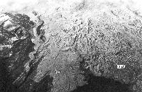 Комбинация обвала и взрыва привела к формированию на поверхности созданной ими обломочной лавины иного рисунка мезо- и микрорельефа, чем на ранее описанном фрагменте чисто обвальной лавины (см. рис.6). Это, прежде всего, протяженные (до 2-3 км), радиально расходящиеся от эруптивного центра узкие грядки, иногда сгруппированные в некое подобие пучков-вееров (рис.8). Почти везде эти грядки доходят прямо до фронтального края обломочной лавины. Широко представлены и ориентированные по нормали к общему направлению движения обломочного материала поперечные зоны разрыва. Местами они даже протяженнее, с большей амплитудой раздвига, чем на обвальной лавине. Контрастнее выглядят и сами мезо- и микроформы рельефа на поверхности лавины, в целом несколько больше (до 15-20 м) здесь относительные превышения вершин холмов и гряд над днищами западин.