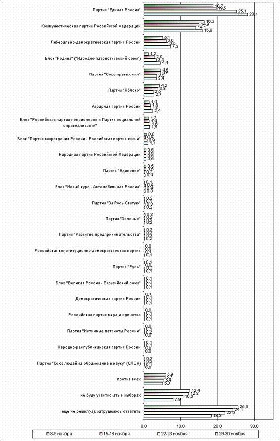 Итоги деятельности "Яблока" со СМИ отражены в итоговых рейтинга проведенных накануне выборов.(рис 4 Вопрос: если вы примете участие в выборах в декабре этого года, за какую партию вы скорее всего проголосуете).