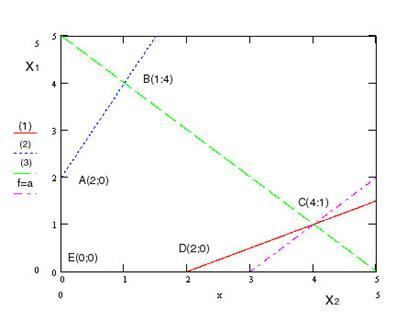 В нашем примере прямая f=aпересевает область ABCDEв точке С(4;1). Поскольку это последняя точка пересечения, max(f)=f(C)=f(4;1)=19.