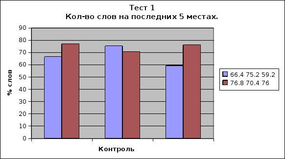 По данным описательной статистики среднее значение результатов тестирования контроль №1 Утро и контроль №3 Утро уменьшилось от предъявленных на последних пяти местах в списке - от 66% до 52%; контроль №1 Вечер и контроль №3 Вечер незначительно уменьшилось - от 77% до 76%. Средний разрыв между утром и вечером всех 3 контролей составил не более 10%. Результаты сравнительной статистики не достоверны (более 0,05).