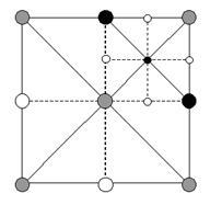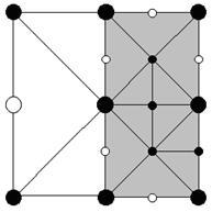 Рис 6. Пример меша. Включенные вершины помечены черным. Серые треугольники отрисованы во время рекурсивного вызова Render() для сопоставленных им подквадратов. Белые треугольники отрисоввываются во время изначального вызова Render() для этого квадрата.