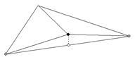 Рис. 7. Vertex interpolation error. Когда вершина включена или выключена, меш меняяет форму. Максимальное изменение, получающееся при включении вершины показано пунктирной линией. Величина изменения есть разница между реальной высотой вершины (черная точка) и высотой ребра под ним (белая точка). Белая точка - это просто середина между 2 серыми точками. (Wolverene: Середина - так как мы рассматриваем измельчающиеся квадраты в quadtree и точка деления лежит ровно посередине).