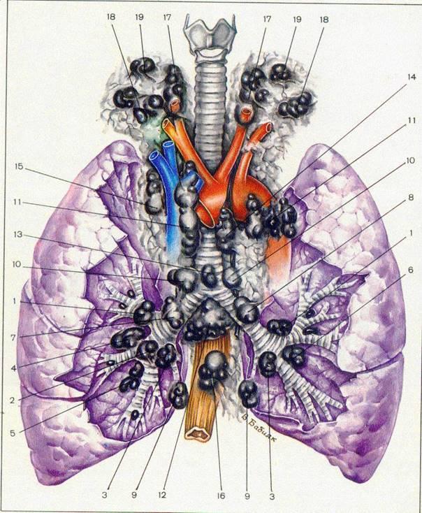 лимфатические узлы, принимающие лимфу от легких, наиболее многочисленны и располагаются в клетчаточных