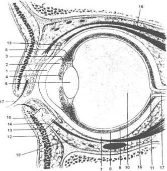 6 - ресничная мышца: 7 - склера: 8 - сосудистая оболочка; 9 - сетчатка; 10 - стекловидное тело: 11 - сосок зрительного нерва: 12 - мышца века; 13 -конъюктива: 14 - хрящ нижнего века: 15 - железы хряща века; 16- мышца, однимающая верхнее веко: 17-ресницы: 18 - жировое тело глазницы; 19 -верхний конъюктивальный мешок.
