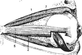 1 - прямая верхняя мышца; 2 - прямая нижняя мышца; 3 - нижняя косая мышца: 4 - верхняя косая мышца; 5 - прямая наружная мышца; 6 -прямая внутренняя мышца; 7 - мышца, поднимающая верхнее веко, 8 - блок фиброзно-хрящевой петли