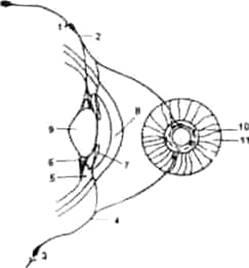 1 - ресничный ганглий, (цилиарный): 2 -короткие ресничные нервы; 3 - верхний шейный симпатический ганглий; 4 -симпатические нервы, (цилиарная); 5 -ресничная мышца 6 - волокна капсулы хрусталика: 7 - радужная оболочка: 8 -роговая оболочка.9 – хрусталик. 10 -кольцевая мускулатура радужной оболочки.11 - радиальная мускулатура радужной оболочки