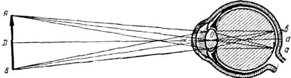 Глаз представляет собой сложную оптическую систему линз, которые образуют на сетчатке перевернутое и уменьшенное изображение внешнего мира.