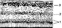 1 - склера. Состоит из беспорядочно расположенных коллагеновых волокон; 2 - собственно сосудистая оболочка: 3 - пигментные клетки.