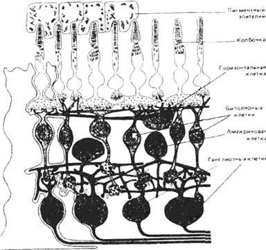 Таким образом, импульсы от фоторецепторов далее подходят к биполярным клеткам. Каждая такая клетка связана с несколькими палочками и колбочками. В свою очередь, одна ганглиозная клетка контактирует со многими биполярными клетками. Фоторецепторы, соединенные с одной ганглиозной клеткой, образуют рецептивное поле ганглиозной клетки. Причем, рецептивные поля ганглиозных клеток перекрывают друг друга, что связано с наличием горизонтальных и амакриновых клеток, соединяющих по горизонтали биполярные и ганглиозные клетки. Поэтому одна ганглиозная клетка может быть связана с десятками тысяч фоторецепторов. В сетчатке есть центробежные нервные волокна, которые могут регулировать количество нейронов, охваченных возбужден.