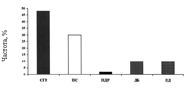 Рис. 2. Частота аффективных расстройств, связанных с репродуктивным циклом у женщин (синдром "грусти рожениц" – СГР, предменструальный синдром – ПС, предменструальное дисфорическое расстройство – ПДР, депрессии беременности – ДБ, послеродовые депрессии – ПД) в изученных выборках (по данным B. Andersch и соавт., 1986; М. Gitlin и соавт., 1989; L. Gotlib и соавт., 1989; Dalton и соавт., 1993; В. Parry, 1995; Т. Pearlstein, 1995; К. Jonkers и соавт., 1996).