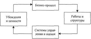 Представим компанию после проведения БПР в виде замкнутой бизнес системы, изображенной на рис.1. Стрелки между элементами этой структуры показывают характер их взаимодействия: блок «Бизнес-процесс» определяет содержание блока «Работы и структуры», связанного с блоком «Системы управления и оценок», который, в свою очередь, определяет работу блока «Убеждения и ценности», влияющего на блок «Бизнес-процесс».