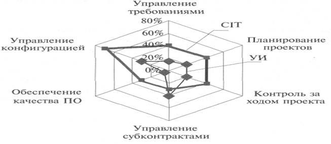 Исходя из оценки зрелости ОКП по итогам внедрения СММ, CIT (схема 4) ближе ко второму уровню СММ. Наблюдается отставание только по двум ОКП: «Управление работами с субподрядчиками» (связано с тем, что привлечение субподрядчиков было эпизодическим) и «Обеспечение качества ПО»