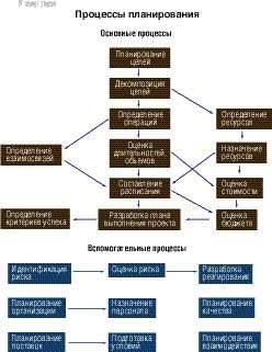 - процессы планирования — определение целей и критериев успеха проекта и разработка рабочих схем их достижения;