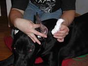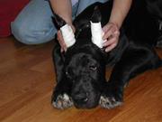 После этого ушные раковины укладывают на затылке на марлевую подушечку и прибинтовывают. Время снятия повязки после операции – предмет активных споров специалистов ветеринарной хирургии. Одни врачи рекомендуют снимать повязку на 3 – 4-й день, а другие – через 3-4 часа, и вообще подвергают сомнению саму целесообразность её наложения.