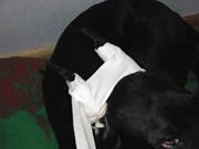 Основная задача - тщательно ухаживать за швами в течение последующих 7-14 дней. Ухаживая, таким образом, за швом нужно следить за тем, чтобы щенок не расчесал больное место. Когда швы начнут подживать, они будут вызывать сильно чесаться. Для предупреждения расчесывания, сооружают для собаки воротник. Материал: плотный картон, тонкий и мягкий пластик, а также плотный полиэтилен, сложенный в несколько слоев.