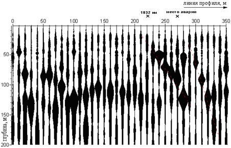 Летом 2000-го года было сделано профилирование вдоль 12-километрового участка под Уфой трассы газопровода Уренгой-Новопсков, когда службам эксплуатации стало очевидно, что аварии там повторяются в одних и тех же местах. Исследования методом ССП показали, что действительно, все происшедшие на этом участке аварии, пришлись на зоны тектонических нарушений. На рис.2 приведен ССП-разрез, пройденный рядом с местом аварии на трубопроводе, вблизи с пикетом "1832 км". Две почти параллелльные образующие V-образных объектов являются индикацией зоны тектонического нарушения.