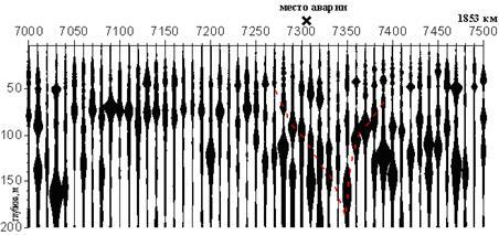 На рис.3 приведен ССП-разрез, пройденный вблизи с пикетом "1853 км", также рядом с местом аварии на трубопроводе. Здесь авария произошла в расположении самого V-образного объекта.