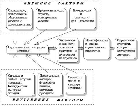 Описанный нами интеллектуальный процесс позволяет выявить то, что компания могла бы сделать в отношении к существующим в рыночной среде возможностям, а также то, на что она способна в отношении к актуальным способностям и ресурсам. Кроме того, указанный процесс позволяет привести эти две точки зрения в некое оптимальное соответствие. При определении стратегии необходимо также принять во внимание — вне зависимости от чисто экономических соображений, — какой путь развития предпочитает глава компании и его ближайшее окружение. Личные ценности, надежды и идеалы могут и должны оказывать влияние на итоговое решение, а потому мнение и желание руководства компании непременно должны войти в состав стратегического решения.