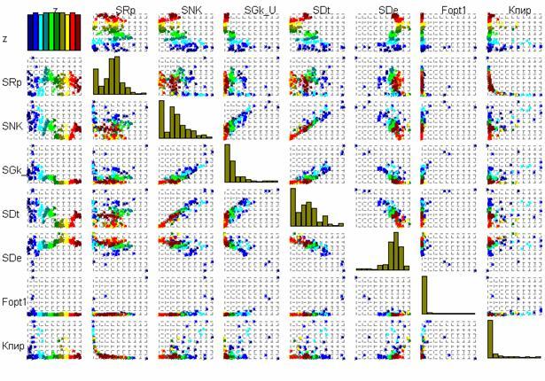Нам представляется наиболее интересной обработка данных по отложениям баженовской свиты для одного из месторождений Западной Сибири. В качестве наиболее адекватного набора переменных были выбраны содержания глин, известняка, доломита, керогена, пирита, пористости и насыщения.