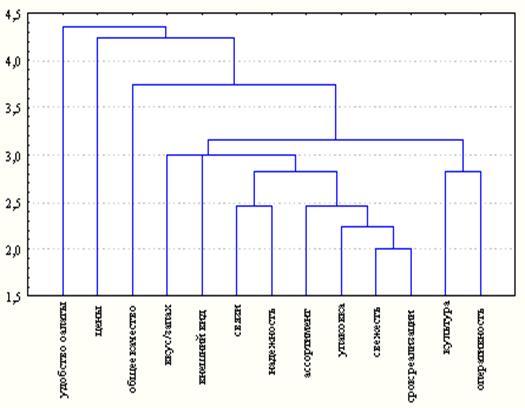 На рис. 7 представлены результаты группового анализа, в ходе которого все конкурентные качества ОАО «БКК» сгруппировались в следующие кластеры: