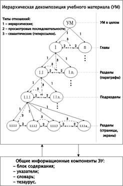 Кроме того, в структуре ЭУ, как правило, можно выделить набор общих информационных компонентов, ассоциируемых с учебными материалом, но не охватываемых его иерархической декомпозицией. К их числу относятся: блок содержания, словарь (глоссарий), указатели, тезаурус.