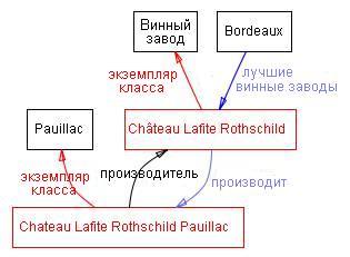 ChвteauLafiteRothschildPauillac - крепкое, оно производится на винном заводе ChвteauLafiteRothschild. У нас есть два слота, которые описывают вино в этом примере: слот крепость со значением «крепкое» и слот производитель со значением «винный завод ChвteauLafiteRothschild». Мы можем сказать, что на уровне класса у экземпляров класса Вино есть слоты, которые описывают вкус, крепость, уровень сахара, производителя вина и т.д.[1]