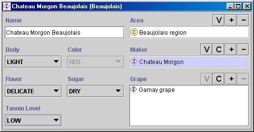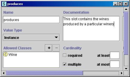 Рис. 3. Слоты класса Вино и фацеты этих слотов. Значок “I” рядом со слотом производитель указывает, что у слота есть обратный слот (Глава 5.1.).