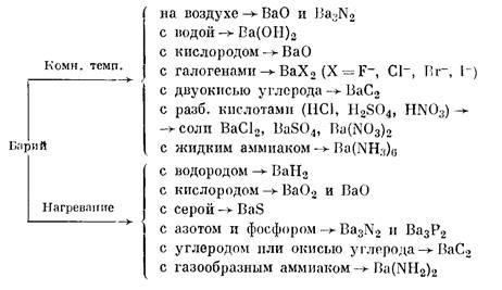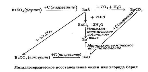 Oна ртутном катоде. Во избежание контактов с воздухом все эти процессы ведут в вакууме или защитной атмосфере. В процессе промышленной переработки барита или витерита получают хлорид или окись бария, из которых металлотермическим восстановлением вырабатывают технический барий (см. схему 1).