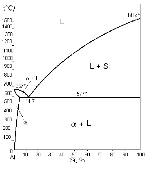 2. В сплавах с содержанием Si 1.0% и выше зафиксирована кристаллизация эвтектической составляющей, причём чем больше в сплаве кремния, тем больше эвтектики. Поэтому интервал кристаллизации этих сплавов значительно больше, так как в этом случае участвуют два превращения – кристаллизация твёрдого раствора и эвтектики, протекающая для этих составляющих при различных температурах. Обращает на себя внимание тот факт, что с увеличением содержания кремния с 1.0 до 5.0% интервал кристаллизации уменьшается с 87 до 64° С. Это связано с тем, что с увеличением кремния ликвидус сплавов существенно снижается, а солидус остаётся практически неизменным, так как кристаллизация этих сплавов завершается кристаллизацией эвтектики (a + Si) при постоянной температуре.