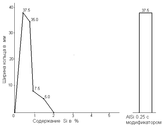 Характер изменения темпа кристаллизации сплавов с содержанием кремния от 1.0 до 5.0% существенно отличается. Достигнув максимума в начале кристаллизации, когда линейная усадка ещё не получила своего развития, темп кристаллизации затем плавно снижается с приближением к температуре солидус. И только у сплавов, содержащих 3.0 и 5.0% Si, вблизи температуры солидус темп кристаллизации вновь несколько увеличивается. Но это происходит практически при неизменной температуре кристаллизации эвтектической составляющей, когда линейная усадка приостанавливает своё развитие и вновь начинает увеличиваться только после полного затвердевания сплава. Такой характер кристаллизации должен благоприятно сказываться на снижении горячеломкости, что подтверждается результатами исследований этого сплава с помощью кольцевой пробы.