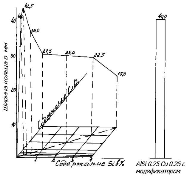 Сразу же, после измерения газосодержания, из свежерасплавленного металла под температурой 720-740° отбирали мерную порцию для определения горячеломкости по кольцевой пробе. Диаметр стального стержня кокиля подбирали для каждого сплава так, чтобы можно было установить, в каком направлении изменяется горячеломкость при введении газа в расплав. Затем из исходного металла отбирали порцию расплава, которую обрабатывали водяным паром в отдельном тигле, находящемся в другой печи. Проходя через алюминиевый расплав, водяные пары разлагались, и расплав обогащался водородом. Из обработанного водяным паром расплава отбирались по одной пробе на газосодержание и на горячеломкость. После этого повторно отбирали пробы на газосодержание и на горячеломкость из остатка исходного расплава, не обработанного паром; затем вновь отбирали порцию расплава для обработки паром и т. д. Средние результаты по 10-12 чередующимся пробам из исходного и обработанного паром расплавов представлены в таблице 1. После обработки водяным паром