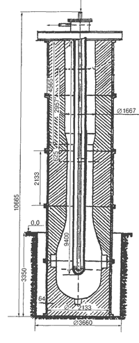 Одной из наиболее удачных следует считать идею американца Родмана, который предложил использовать металлический водо-охлаждаемый стержень для оформления внутреннего канала пушки. Одновременно в процессе затвердевания и охлаждения пушки наружная поверхность формы, изготовленной в металлических жакетах, подогревалась При этом затвердевание ствола пушки происходило последовательно от внутренних слоев к наружным, т е реализовался принцип направленного затвердевания. Ствол пушки с литым каналом получался плотным, без дефектов. Используя частично эту идею (без обогрева снаружи) в 1869 г на Мотовилихинском заводе в Перми была отлита самая крупная (массой 44,2 т) в мире чугунная пушка калибром 20 дюймов Форму высотой 10665 мм (рис. 9) изготавливали по способу «быстрой формовки» из песчано-глинистой смеси с последующей сушкой Форма состояла из пяти частей, заформованных в металлических жакетах (опоках).