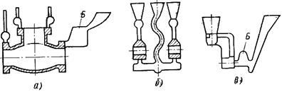 шлакоуловители и плоские щелевидные питатели. Тонкостенные мелкие отливки заливают сверху (рис. 2.16, а), обычно с подводом расплава в питающую бобышку Б.