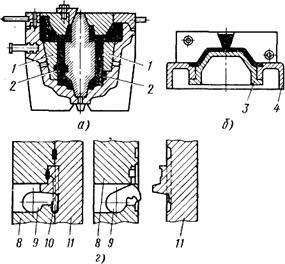 Кокиль (рис. 2.1) обычно состоит из двух полуформ 1, плиты 2, вставок 10.
