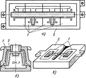 Металлические стержни, выполняющие наружные поверхности отливки, называют вкладышами (рис. 2.8, а). Вкладыши затрудняют механизацию и автоматизацию процесса, так как их уста-