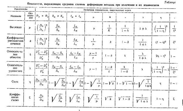 Каждый из этих показателей в разных математических выражениях, приведенных в табл., связывает поперечные сечения деформируемою металла до и после процесса и этим до некоторой степени характеризует степень деформации в рассматриваемом процессе Поэтому все перечисленные показатели связаны между собой точными геометрическими соотношениями, основанными на законе практического постоянства объема при пластических деформациях, также указанными в табл.. В практических расчетах часто применяют показатель 5 — «относительное обжатие», представляющих собой, как это указано в табл., отношение уменьшения поперечного сечения протягиваемого металла к начальному поперечному сечению (до протяжки). Применение этого показателя при волочении, а также и при других процессах обработки металлов давлением, перенесенное из теории упругих деформаций, нельзя считать достаточно теоретически обоснованным