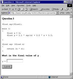С точки зрения пользователя интерфейс системы остался практически тем же, что и в предыдущей версии. Параметризованное упражнение выдается студенту в виде вопроса «открытого типа» (рис. 1а). Одна или более констант, присутствующие в теле вопроса, определяются значением формирующего параметра. Таким образом, они различны для разных студентов или для одного и того же студента, отвечающего на вопрос несколько раз. Студент должен заполнить поле ответа и нажать кнопку «Submit» («Отправить»). В ответ система генерирует экран оценки (рис. 1б), позволяющий студенту проанализировать вопрос и ответ. В частности, студент может решить попробовать ответить на вопрос еще раз, воспользовавшись кнопкой браузера «Назад» и перезагрузив вопрос. Мы приглашаем читателей пройти опытный тест по адресу: http://www2.sis.pitt.edu/~taler/QuizPACK.html