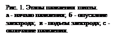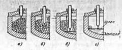 Расплавление скрапа необходимо вести по возможности скорее и с минимальным расходом энергии. Зачастую длительность его превосходит половину продолжительности всей плавки и при этом расходуется 60-80% всей электроэнергии. Характерной особенностью периода является неспокойный электрический режим печи. Горящая между концом электрода и холодным металлом дуга нестабильна, ее длина невелика и сравнительно небольшие изменения в положении электрода или металла (обвал, сдвиг подплавленного куска скрапа) вызывают либо обрыв дуги, либо, наоборот, короткое замыкание. Ход плавления шихты в дуговой печи иллюстрируется рис.1. Дуга загорается сначала между концом электрода и поверхностью шихты (рис.1, а), причем для повышения ее устойчивости в первые минуты под электроды обычно подкладывают куски кокса или электродного боя. После сгорания последних начинает подплавляться металл я каплями стекать на подину. В шихте образуются колодцы, в которые углубляются опускающиеся электроды (рис.16) до тех пор, пока они не достигнут подины, на которой во избежание перегрева ее к этому моменту должна быть образована лужа расплавленного металла (рис.1в). Это самый беспокойный, неустойчивый период горения дуги; подплавляемые куски шихты падают на электрод, закорачивая дугу опускании куска шихты под торцом электрода может, наоборот, наступить обрыв тока. Горящая между электродом и расплавленным металлом дуга перегревает металл: начинается размыв и расплавление шихты, окружающей колодцы. Колодцы расширяются, уровень жидкого металла в ванне начинает повышаться, а электроды-подниматься (рис.1в). В конце этого периода почти весь металл оказывается расплавленным; остаются лишь отдельные куски шихты на откосах («настыли», рис.1г), расплавляющиеся последними. Чтобы не затягивать период расплавления, обычно эти «настыли» сбрасывают ломом в глубь ванны. Период расплавления считают законченным, когда весь металл в печи перешел в жидкое состояние. К этому моменту режим горения дуги становится более спокойным, так как температура в печи выше, поверхность металла покрыта слоем шлака, образованным заброшенными в печь в период расплавления кусками извести и всплывающими окислами; длина дуги по сравнению с началом расплавления увеличивается в несколько раз дуга горит устойчивее, количество толчков тока и обрывов уменьшается.