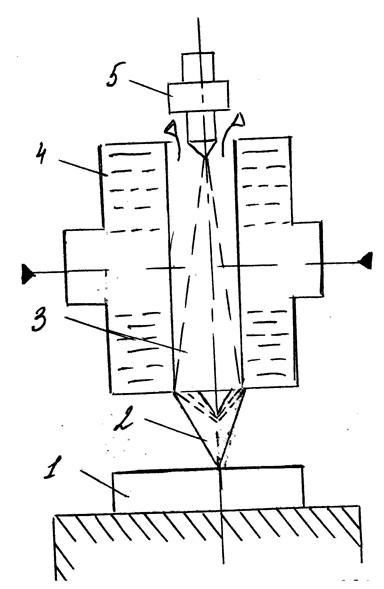 Дуговой разряд 3 возбуждается между вольфрамовым электродом 4, выполненным в виде трубы и охлаждённым проточной водой. В трубу подают газ (аргон, азот и др.) или смесь газов. Обжимая дуговой разряд, газ при соединении с электронами ионизируется и выходит из сопла головки в виде ярко светящейся струи 2, которая направляется на обрабатываемую заготовку 1.