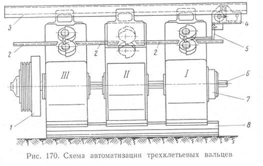 Схема автоматизации трехклетьевых вальцев показана на рисунке. Рабочие клети I - III смонтированы на общей плите 8 и имеют привод от общего шлицевого вала 6. В каждой клети есть зубчатый перебор для привода вальцев и радиальная регулировка валков. Расстояние между рабочими клетями может регулироваться в зависимости от длины вальцуемой заготовки. На валу 6 расположены фрикционные муфта 1 и тормоз 7. В верхней части рабочих клетей закреплена направляющая 3 для толкающего подающего устройства 4 с откидным захватным органом 5 толкающего типа, имеющим электрический привод. Между рабочими клетями установлены направляющие лотки 2, по которым перемещается заготовка от одной клети к другой.