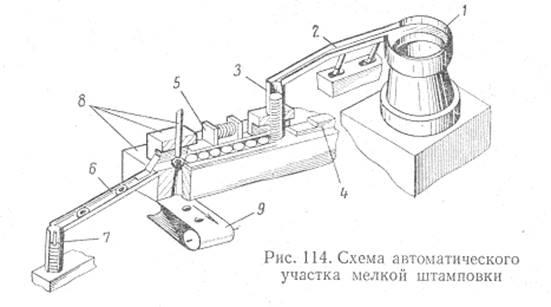 На рисункепоказана схема автоматического участка штамповки шайб (пробивка отверстия). Заготовки (кружки) наваломзасыпаются в бункер 1, ориентируются в нем и по лотку 2 подаются в специальный накопитель 3. Из накопителя подающее устройство 4 шиберного типа подает заготовки непосредственно на рабочую позицию в штамп 8, где осуществляется пробивка отверстия. Деталь после пробивки остается на пуансоне и после ее специальным съемником выносится толкателем 5 на лоток 6и попадает в стапелирующее устройство 7. Отходы (просечки) специальным транспортером 9 выносятся из рабочей зоны пресса.